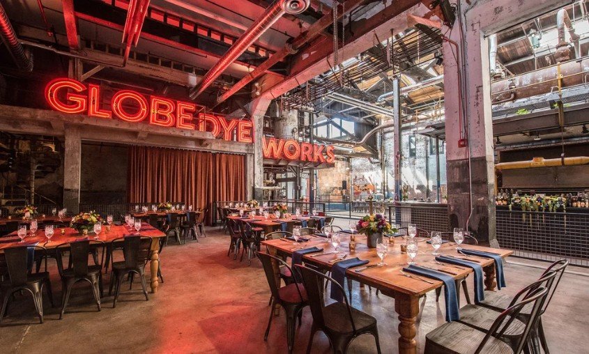 Globe Dye Works is a former textile factory reimagined as a modern event space, featuring clean industrial lines and abundant natural light. The minimalist aesthetic allows couples to fully customize the space while maintaining a refined, contemporary look. It’s especially appealing for those who want a blank canvas with architectural interest. → View a real wedding [link]