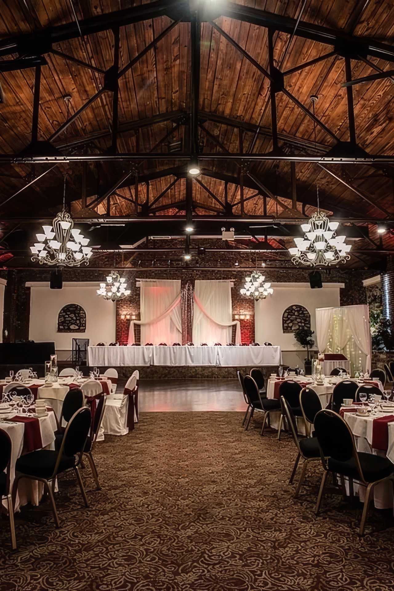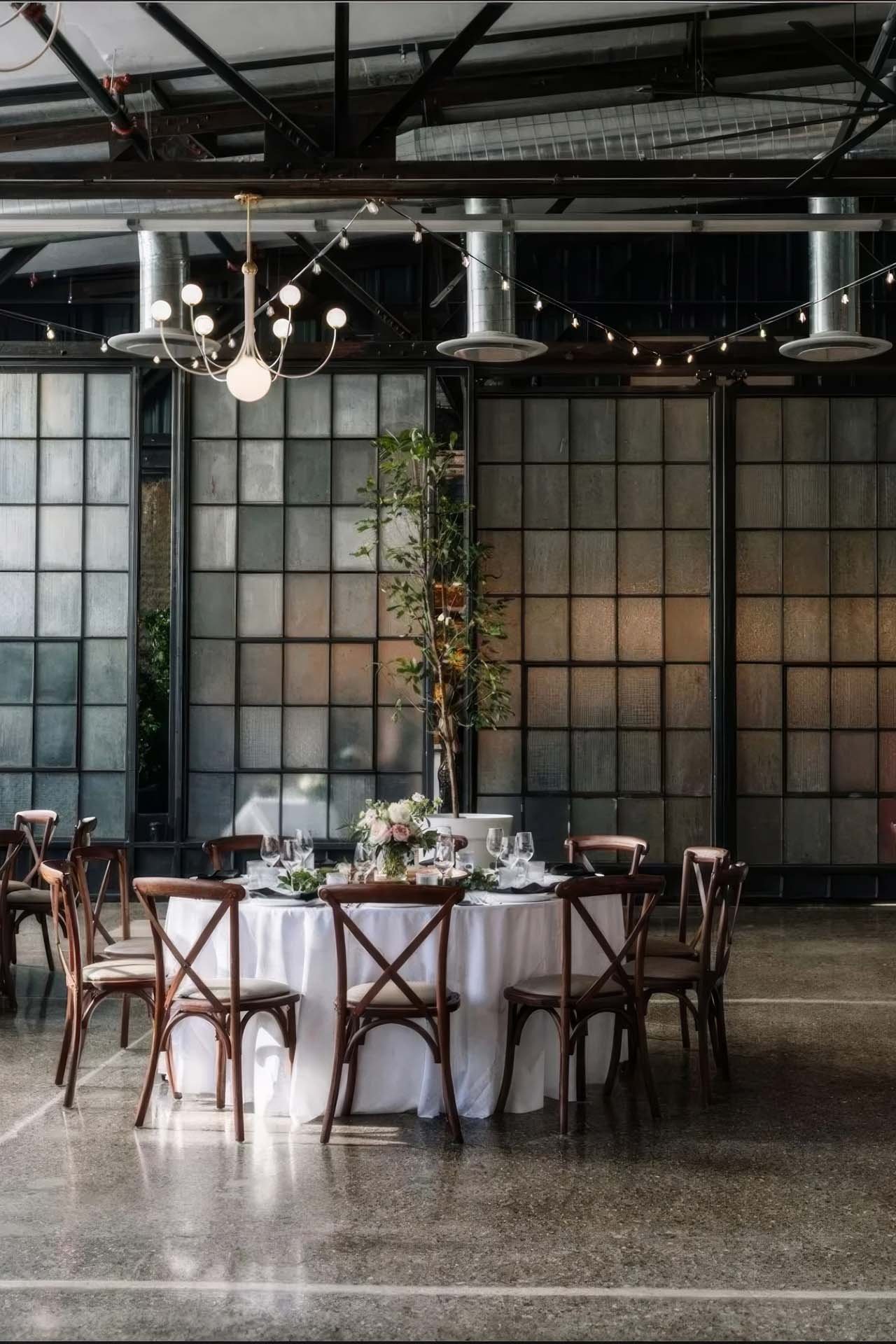 Blending historic industrial character with refined event design, Power Plant Productions offers a space that feels both raw and elevated. Exposed brick, steel beams, and warm lighting create depth and texture, while the layout allows for seamless flow between ceremony and reception. It’s a strong choice for couples drawn to industrial spaces with a more polished feel. → View a real wedding : Power Plant Productions Wedding
